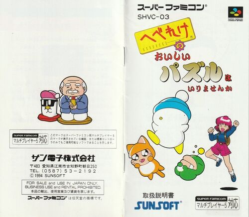 『へべれけのおいしいパズルはいりませんか』 1994年発売/スーパーファミコン/テーブルゲーム/サン電子株式会社 タイトルを見れば当然パズルゲームだと思うだろうが、実際はすごろく風のマップを進みつつ、各種ミニゲームに挑戦していくボードゲームであ…