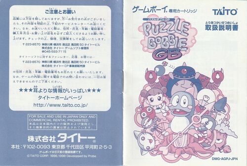 『パズルボブルGB』 1998年発売/ゲームボーイ/パズル/株式会社タイトー プレイステーション版『パズルボブル2』の移植作。「ひとりでパズル」「ひとりで対戦」に加え、全88面の「タイムアタック」モードを遊ぶことができる。白黒画面だが、バブルの模様が…