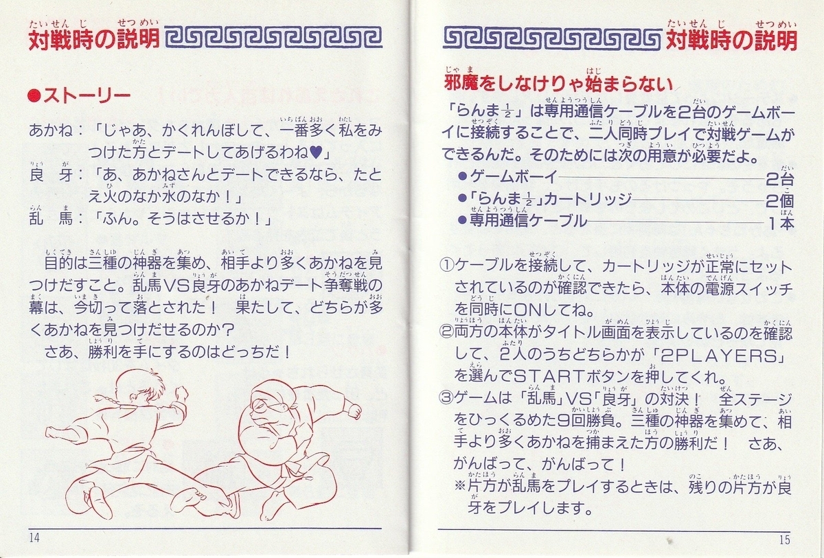 「らんま1/2」初のゲーム作品。プレイヤーは乱馬(2P時は良牙)となって、障害物をどかしながらステージ内を探索する。手袋・帽子・マフラーを集めると出現するあかねに触れればクリア、というパズル要素のあるアクションゲーム。