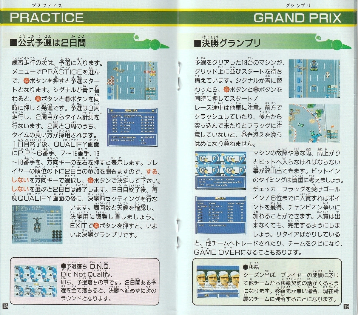 PCエンジンで発売された『F1サーカス』の移植版。コースの種類が増えたほか、タイムアタックモードとスポット参戦モードが追加されている。チーム・ロータスとタイアップしており、ロータスの面々は実名で登場するが、その他のチームはホンデだのフェリーレだの「くろまて」式の偽名になっている。
