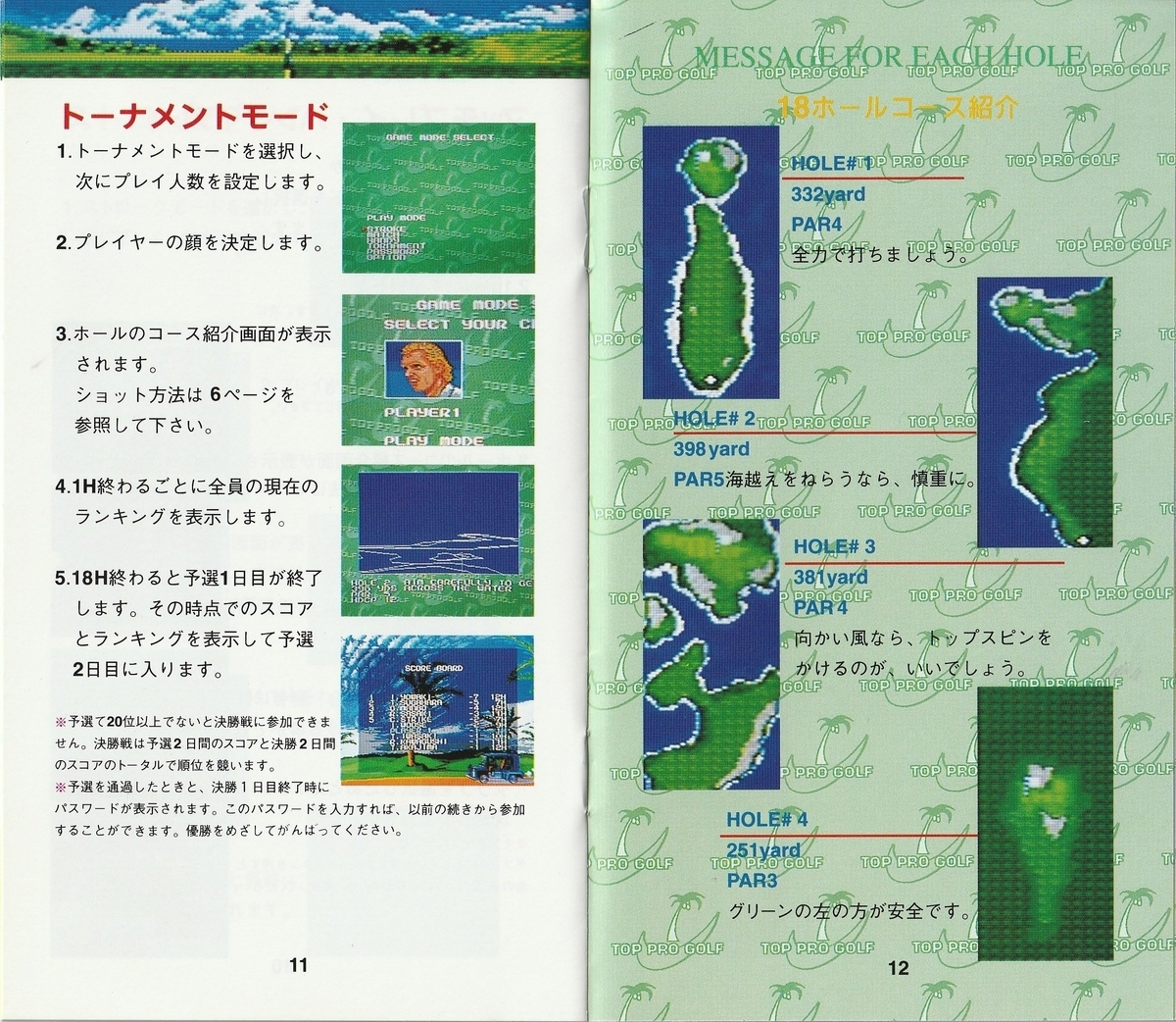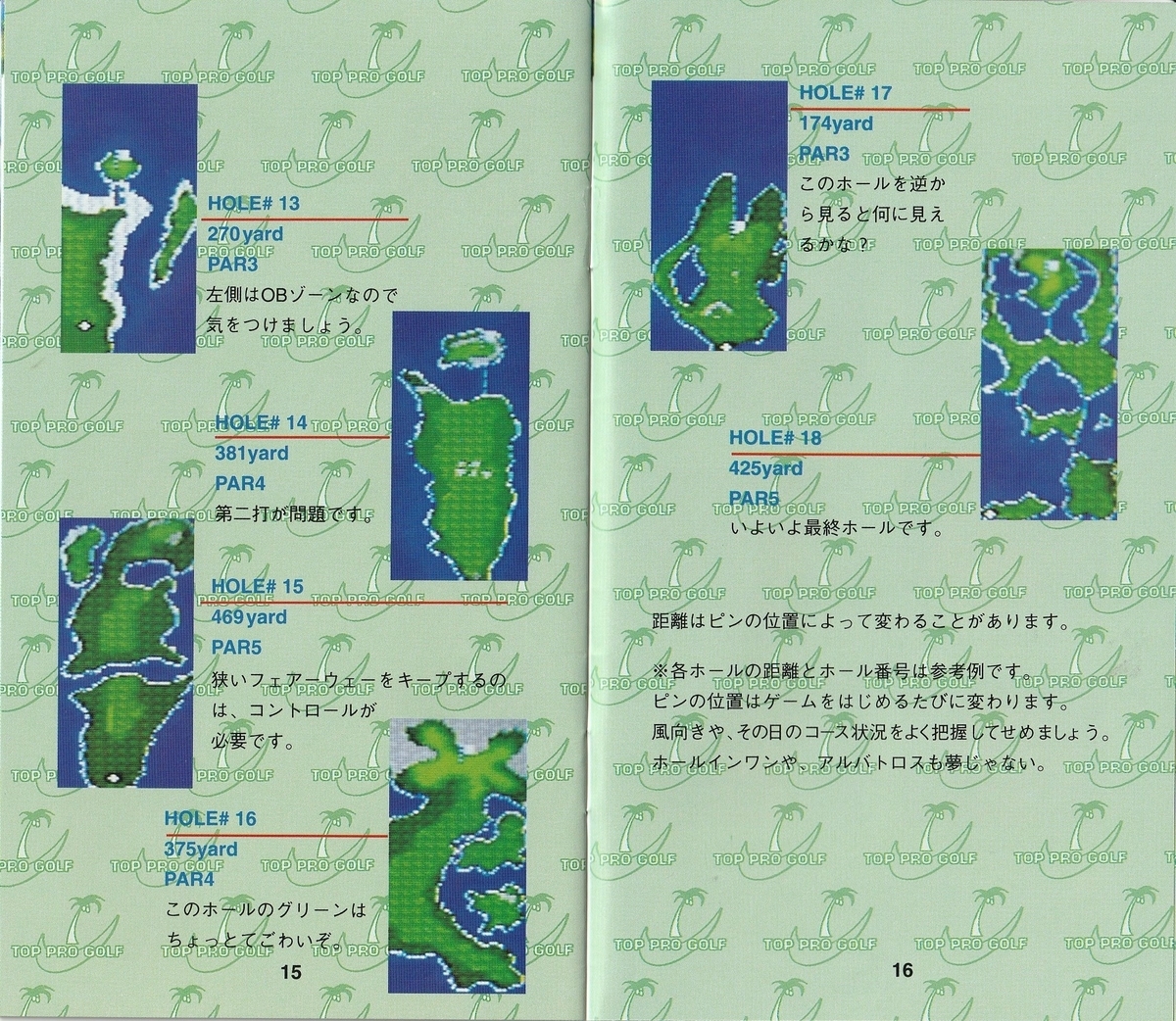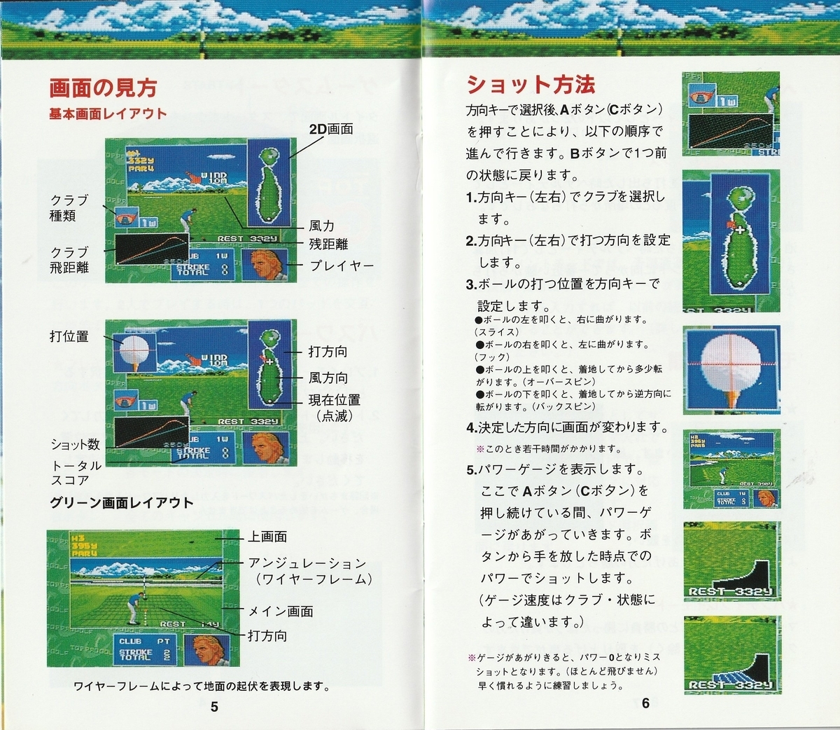 一般的なゴルフゲームは「増減するパワーゲージを、タイミングよくボタンを押してショット」という操作方法を取っているが、本作は「ボタンを押し続けている間パワーゲージが増減し、ボタンを離すとショット」という形式。これが地味にやりづらい、というかどうにも爽快感が無い。王道の操作方法にはそれなりに意味があるのだなと再確認。