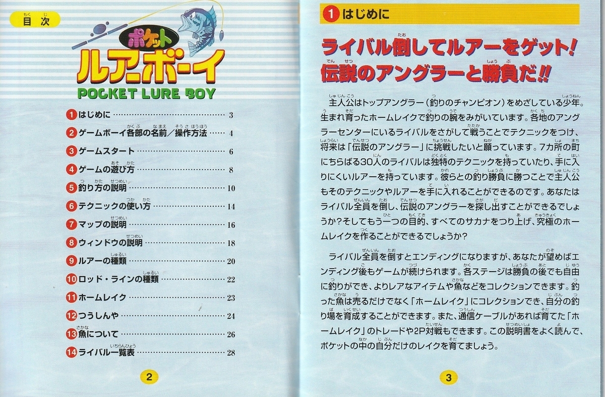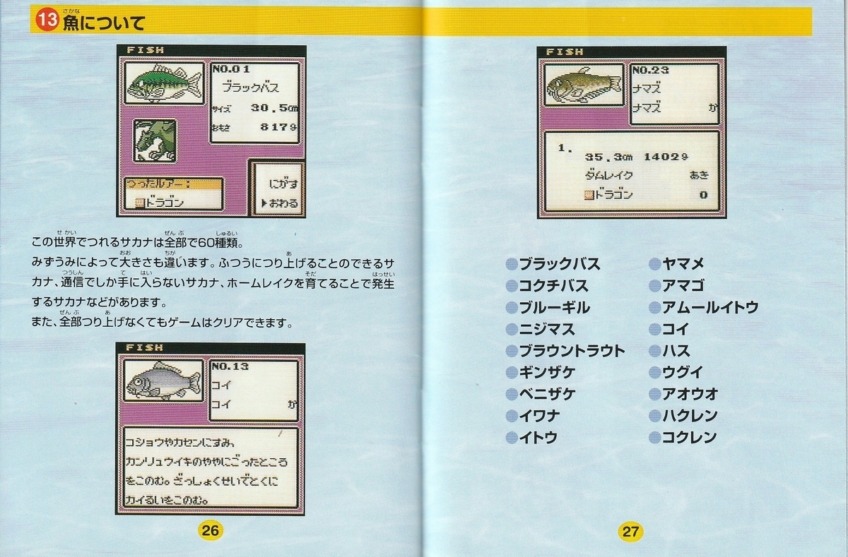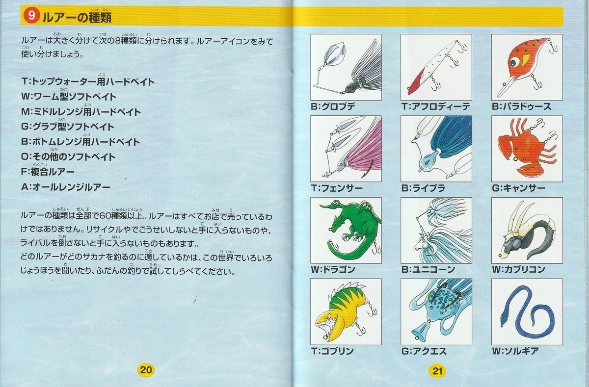 60種類以上のルアーを駆使して、30人のライバルたちと勝負していく釣りゲーム。登場するサカナは60種類とそこそこ。フィールドや主人公のデザインなどは妙に『ポケモン』に近い。肝心のルアーに関してはどうでもいい部分が凝っている一方、攻略に役立つゲーム内情報が少なめ。その一方で釣り自体があまり面白くないので、中身がアイデアが追い付いていないというかなんというか…。